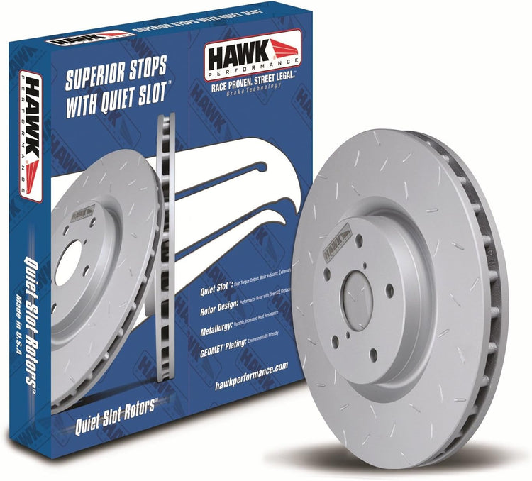 Get quiet stops with the all-new Quiet Slot rotors by Hawk Performance. Quiet Slot rotors are engineered specifically for automotive car and truck enthusiasts looking for high performance braking without the noise, dust and reliability issues commonly seen in heavily slotted, dimpled or cross-drilled aftermarket rotors. Some of the key features of the all-new Quiet Slot rotors are the advanced metallurgy, surface finish, and progressive structural and aerodynamic design. The Quiet Slot rotor program also addresses the needs of the automotive installer. The unidirectional vane and slot design eliminates the need to stock left hand and right hand rotors. Hawk Performance has also taken measures to decrease the impact of automotive products on the environment. All Quiet Slot rotors are finished with a GEOMET coating that protects both the internal and external surfaces from rust and corrosion. GEOMET is a proprietary water-based coating dispersion containing metal oxides, metallic zinc and aluminum flakes. The zinc and aluminum platelets align in multiple layers forming a metallic silver-gray coating. Applied as a liquid, the coating becomes totally inorganic after curing at 575-600 degree Fahrenheit (300-315 degree centigrade).
